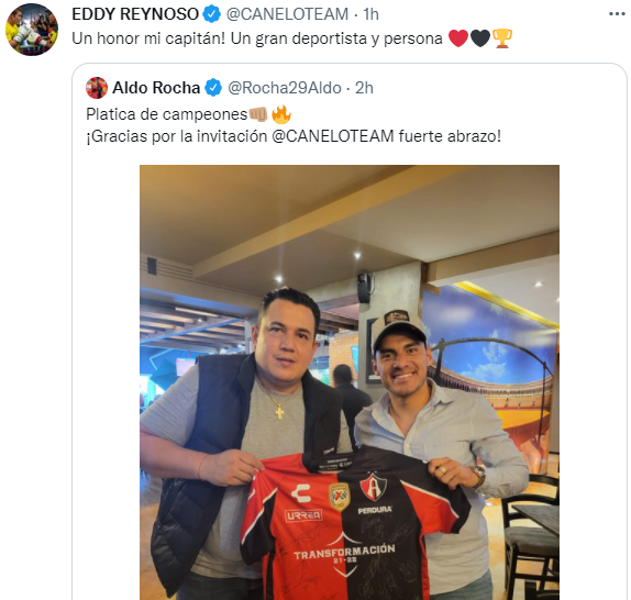 En las últimas horas, uno de los referentes del Atlas dio a conocer un encuentro coneste famoso fanático: se trata del capitán, Aldo Rocha, quien no dudó en llenar en elogios a Eddy Reynoso, a quien le obsequió una playera y le agradeciópor el encuentro. “Platica de campeones ¡Gracias por la invitación @CANELOTEAM fuerte abrazo!”, escribió junto a la imagen.