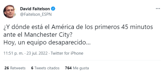 “¿Y dónde está el América de los primeros 45 minutos ante el Manchester City?”, se preguntó a continuación el periodista de ESPN. “Hoy, un equipo desaparecido. Decepcionante el América de esta noche en Tijuana”, concluyó.