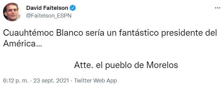 “Cuauhtémoc Blanco seria un fantástico presidente del América… Atte. el pueblo de Morelos”, fueron los polémicos dichos de Faitelson en su cuenta de Twitter