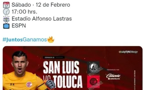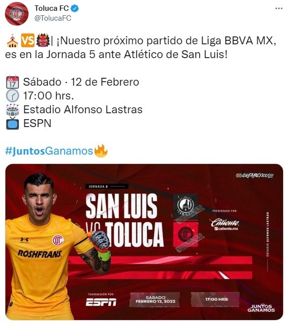 El partido Atlético San Luis vs. Tolucase llevará a caboHOY, sábado 12 de febrero, por la jornada 5 del Torneo Grita México Clausura 2022 de la Liga MX. El duelo se desarrollará en elEstadio Alfonso Lastras Ramírez.