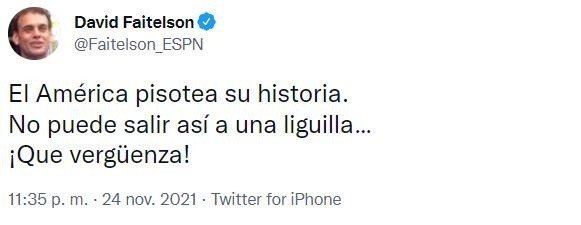 A través de sus redes sociales, Faitelson continuó con la catarata de críticas y dividió las opiniones de los usuarios: “Santiago Solari es un desvergonzado… Es increíble que haya dirigido al Real Madrid. Con esta postura, se burla de la historia del América. No se vale…” o “El América pisotea su historia. No puede salir así a una liguilla… ¡Que vergüenza!”, fueron algunas de sus palabras.