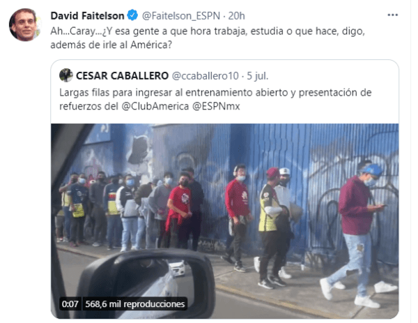 Quien no recibió del todo bien la fiesta americanista fue el periodista David Faitelson, quien se preguntó si esos fanáticos que se dieron cita no tenían nada mejor que hacer a las 9 de la mañana en un día de semana.“Ah caray ¿Y esa gente a qué hora trabaja, estudia o qué hace, digo, además de irle al América?”, escribió en su cuenta de Twitter.