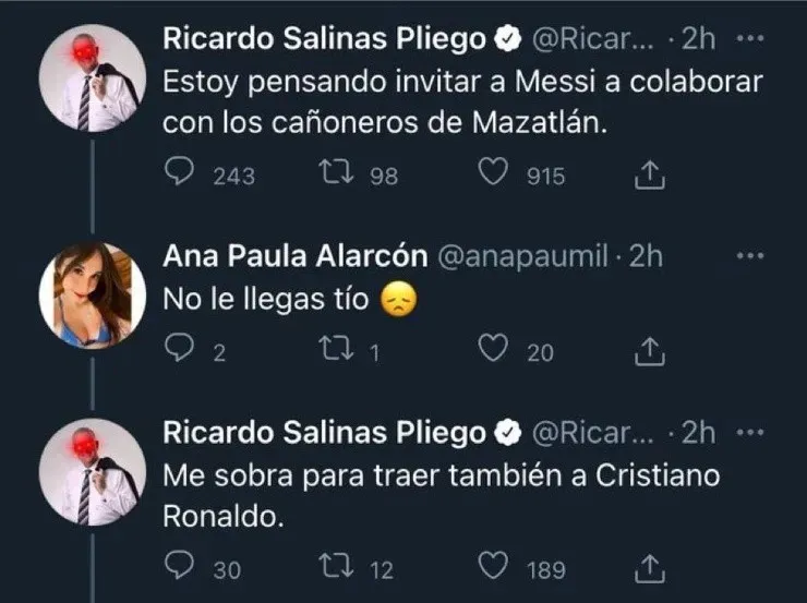 En ese momento, un aficionado le consultó al empresario si desde los números, pudiera contratar a Cristiano Ronaldo para el Mazatlán. Salinas Pliego no dudó y respondió, sin más, de manera afirmativa, lo que generó sorpresa en redes sociales. Pues bien, según parece, Mazatlán no se anda con problemas económicos ni mucho menos. Incluso, el propietario ya había insinuado con contratar a una estrella de esa magnitud, cuando Lionel Messi no renovó su contrato con Barcelona.