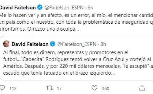 Más allá de quienes coincidieron y quienes no con la decisión del uruguayo, a Faitelson le recriminaron haber hecho público el dinero que este cobraría como salario. El periodista aceptó el error y terminó ofreciendo una disculpa. “Me lo hacen ver y, en efecto, es un errorel mío, el mencionar cantidades en un país como el nuestro, con toda la problemática de inseguridad que afrontamos. Ofrezco una disculpa”, publicó.