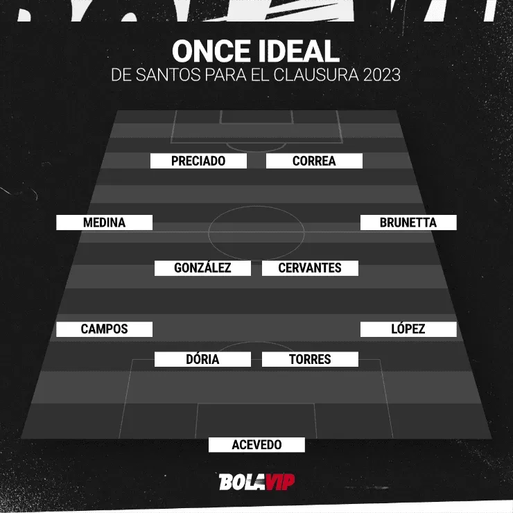 Siguiendo el 4-2-2-2, desde Bolavip jugamos a armar una “alineación ideal” de Santos Laguna con: Carlos Acevedo; Raúl López, Félix Torres, Matheus Doria, Omar Campos; Alan Cervantes, Lucas González; Juan Brunetta, Diego Medina; Javier Correa y Harold Preciado.