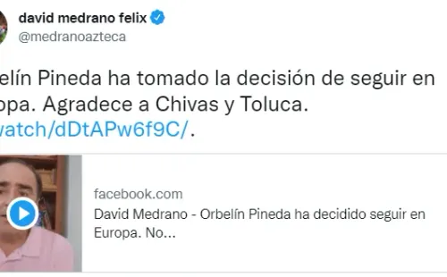 “Quedarse en Europa por lo menos seis meses más es la decisión que ha tomado Orbelín Pineda y que le ha notificado a su representante, para que a su vez se lo haga saber tanto a la gente de Chivas como a la gente de Toluca, que se acercaron con la posibilidad de regresar a Orbelín al futbol mexicano”, relató el reportero de TV Azteca y Récord en un video de Facebook.