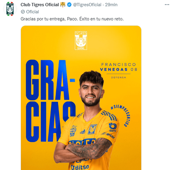 A través de sus redes sociales, Tigres anunció la salida de Francisco Eduardo Venegas de cara al 2023, dando a entender que ya podría tener asegurado su futuro. “Gracias por tu entrega, Paco. Éxito en tu nuevo reto”, escribieron junto a una imagen del lateral izquierdo con la playera Auriazul.