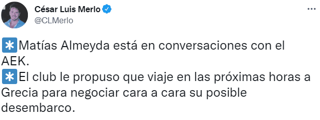 De acuerdo a información de medios de Grecia, Matías Almeyda es el principal candidato a convertirse en entrenador del AEK de Atenas. Sin ir más lejos, reportan que el director técnico y su agente estarían viajando en las próximas horas a Europa para tener una primera entrevista con los directivos del club capitalino, y así comenzar a negociar.