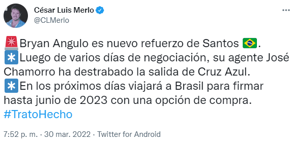 “Bryan Angulo es nuevo refuerzo de Santos. Luego de varios días de negociación, su agente José Chamorro ha destrabado la salida de Cruz Azul. En los próximos días viajará a Brasil para firmar hasta junio de 2023 con una opción de compra. #TratoHecho”, escribió el periodista a través de su cuenta de Twitter.