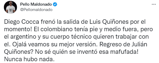 “Diego Cocca frenó la salida de Luis Quiñones por el momento! El colombiano tenía pie y medio fuera, pero el argentino y su cuerpo técnico quieren trabajar con el. Ojalá veamos su mejor versión”, escribió el reportero en su cuenta de Twitter.