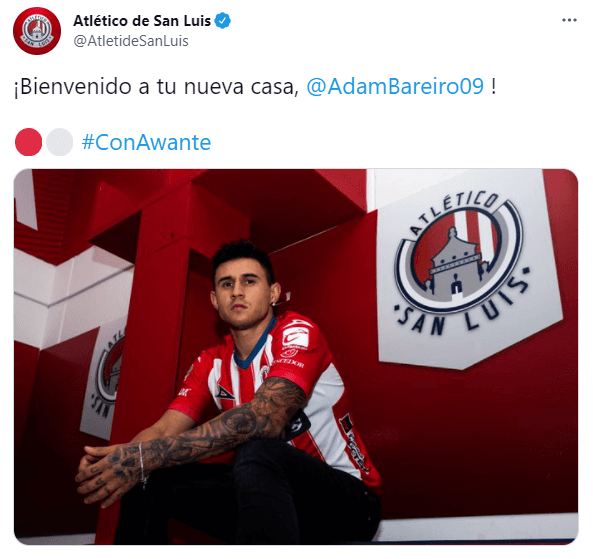 A través de su cuenta oficial de Twitter, el club rojiblanco anunció la incorporación deAdam Bareiro de cara a la próxima temporada, luego de que ambas instituciones llegaran a un acuerdo de préstamo por un año.“¡De Europa al Coloso de Valle Dorado! ¡Bienvenido a la familia Potosina!”, escribieron junto a un video de bienvenida.