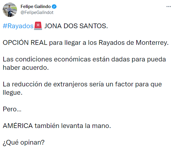 De acuerdo a información del periodista Felipe Galindo, de AS México, Rayados se ha metido en la pelea por el ex mediocampista del Barcelona y Villarreal: “JONA DOS SANTOS. OPCIÓN REAL para llegar a los Rayados de Monterrey. Las condiciones económicas están dadas para pueda haber acuerdo. La reducción de extranjeros sería un factor para que llegue. Pero… AMÉRICA también levanta la mano“.