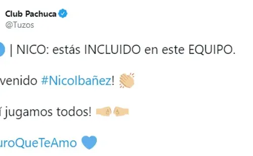 “Gracias por hacerme parte de este equipo. Te juro que te amo, Pachuca”, fueron las primeraspalabras de Nico Ibáñez como refuerzo de los Tuzos para el Apertura 2021, en el mismo video, luego de que elcuadro hidalguense pagara por la mitad de su ficha, la cual le pertenecía al Atlético de Madrid.