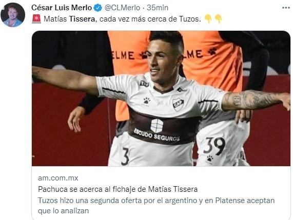 De acuerdo a información de Súper Deportivo, Pachuca estaría muy cerca de llegar a un acuerdo para incorporar a Matías Tissera, delantero de Platense. En la última Liga Profesional 2021(el torneo dePrimera División de Argentina), fue el más destacado de su equipo y ocupó el tercer lugar en la tabla de goleotras haber anotado 14 goles en 21 encuentros.