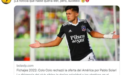 De acuerdo a información confirmadapor Águilas Monumental y Bolavip desde el entorno del futbolista, Pablo Solari desea que Colo Colocumpla la promesa de dejarlo ir una vez finalizado el compromiso Conmebol. Por su parte, es una incógnita si el América insistirá con una nueva propuesta o desistirán “cansados” de las trabas.