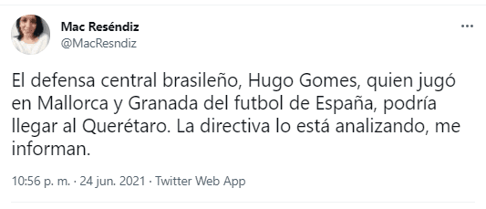 Se trata del defensa brasileño Hugo Gomes, quien juega en la zaga del Estoril Praia de Portugaly sería el apuntado para suplir la frustrada incorporación, tal como informó la periodista de ESPN, Mac Reséndiz.“El defensa central brasileño, Hugo Gomes, quien jugó en Mallorca y Granada del futbol de España, podría llegar al Querétaro. La directiva lo está analizando, me informan”, escribió en su Twitter.
