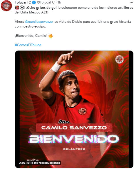 A través de sus redes sociales, los Diablos Rojos anunciaron la llegada de Camilo Sanvezzo como fichaje para el Clausura 2022. “Ocho gritos de gol lo colocaron como uno de los mejores artillerosdel Grita México A21! Ahora Camilo Sanvezzo se viste de Diablo para escribir una gran historiacon nuestro equipo”, escribieron junto a un video en Twitter.