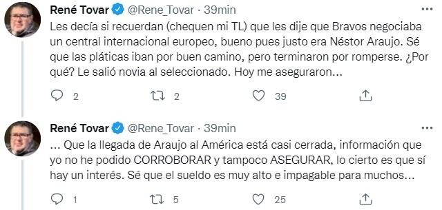 Pues de acuerdo a la información publicada por el editor general deESPN, René Tovar,la llegada de Néstor Araujo al Club América “está casi cerrada”. Así lo dio a conocer a través de su cuenta de Twitter, donde además detalló que el central estaba avanzado con los Bravos de Juárez, pero “simplemente rompió las pláticas porque había otra propuesta”.
