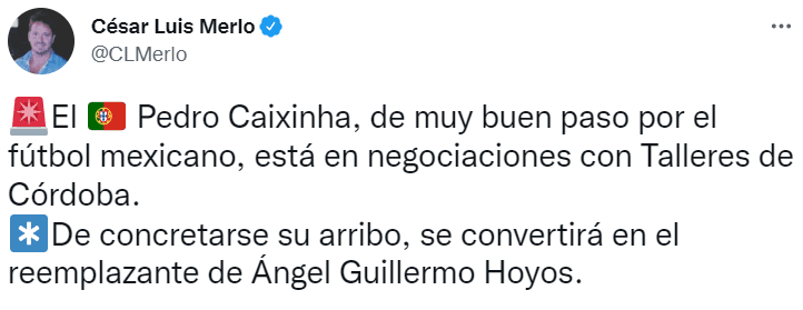 Así lo dio a conocer a través de su cuenta de Twitter, el periodista especialista en Mercado, César Luis Merlo: “El portuguésPedro Caixinha, de muy buen paso por el fútbol mexicano, está en negociaciones con Talleres de Córdoba.De concretarse su arribo, se convertirá en el reemplazante de Ángel Guillermo Hoyos”.