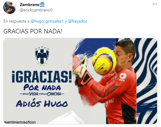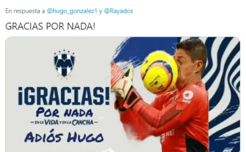 “@hugo_gonzalez1, muchas gracias por tu compromiso y profesionalismo con el Equipo #EnLaVidaYEnLaCancha. ¡Te deseamos éxito en tus futuros proyectos!”, expresaron desde la cuenta de Twitter de Rayados junto a una imagen del arquero que continuó siendo tundido durante el último Guard1anes 2021.