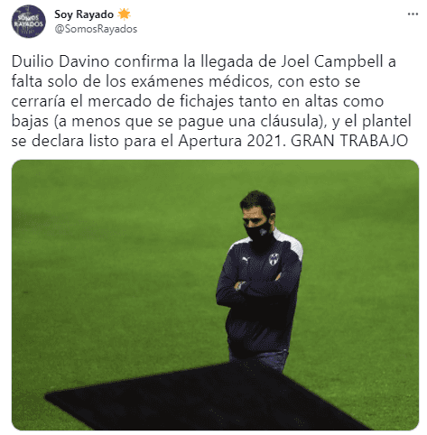 En este contexto, el presidente deportivo del club regio, Duilio Davino, reveló que el ex Arsenal, Betis y Villarreal se encuentra realizando exámenes físicos y médicos para poder ser presentado de manera inminente. Por su parte, el directivo destacó que con la confirmación de este refuerzo, Rayados se retira de la ventana de transferencias.