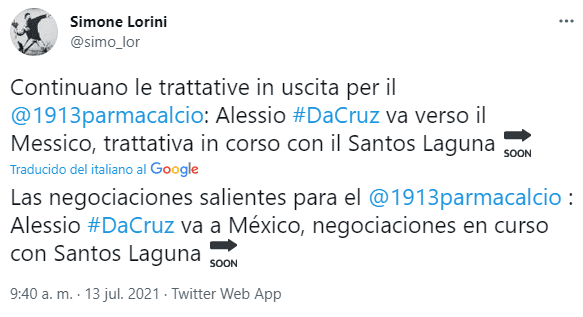 De acuerdo al periodista Simone Lorine, director editorial de ‘Parma Live’ y miembro de TuttoMercato, desde México se encuentran entratativas por Alessio da Cruz, cuya carta pertenece al Parma pero que pasó la última tempoada cedido al Groningen de Holanda.“Las negociaciones salientes para el @1913parmacalcio: Alessio #DaCruz va a México, negociaciones en curso con Santos Laguna“, escribió Lorini en sus redes sociales.