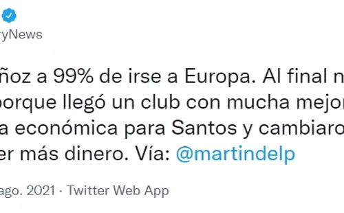 De todas maneras, la misma fuente no hizo público el nombre de la institución que se haría con los servicios del atacante de 18 años, aunque sí aseguró que el traspaso es casi un hecho: “Santi Muñoz a 99% de irse a Europa. Al final no será Huesca porque llegó un club con mucha mejor propuesta económica para Santos y cambiaron de plan para hacer más dinero”.