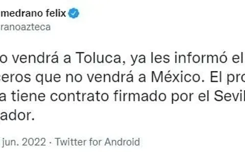 “De Jong no vendrá a Toluca, ya les informó el jugador a los Choriceros que no vendrá a México. El problema es que Toluca tiene contrato firmado por el Sevilla y el propio jugador”, escribió Medrano en su cuenta de Twitter.