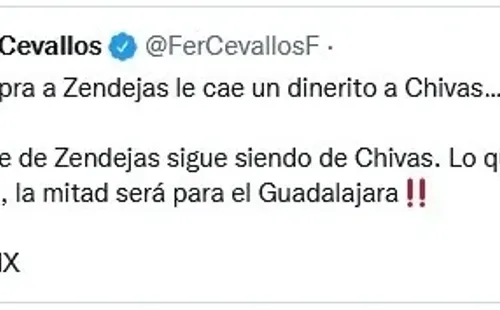 ¿Qué tendría que ver Chivas en todo esto? Conforme al periodista de Fox Sports Fernando Cevallos, el 50 por ciento de la ficha del jugador en cuestión, todavía pertenece al Rebaño Sagrado: “Si el Ame compra a Zendejas le cae un dinerito a Chivas… El 50% del pase de Zendejas sigue siendo de Chivas. Lo que pague el América por él, la mitad será para el Guadalajara“. De ser así, ambos se beneficiarían. En Coapa con una nueva alternativa ofensiva y en Verde Valle con un importe cercano a los 1.5 millones de dólares.