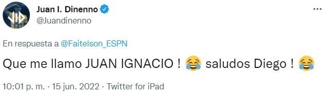 Como respuesta a la pifia del analista deportivo, el propio futbolista salió a responderle en lamisma red social, y le devolvió con un poco de su medicina. “Que me llamo JUAN IGNACIO! Saludos Diego!”, le comentó Dinenno.