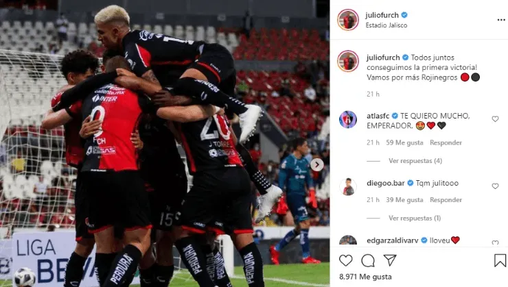 A través de sus cuentas personales de Instagram y Twitter, el delantero sudamericano que ilusiona a todos en el mundo del equipo tapatío,compartió un emotivo mensaje para sus compañeros y aficionados: “Todos juntos conseguimos la primera victoria!!! Vamos por más Rojinegros”, compartió el futbolista Julio César Furch tras sumar su primer triunfo”.