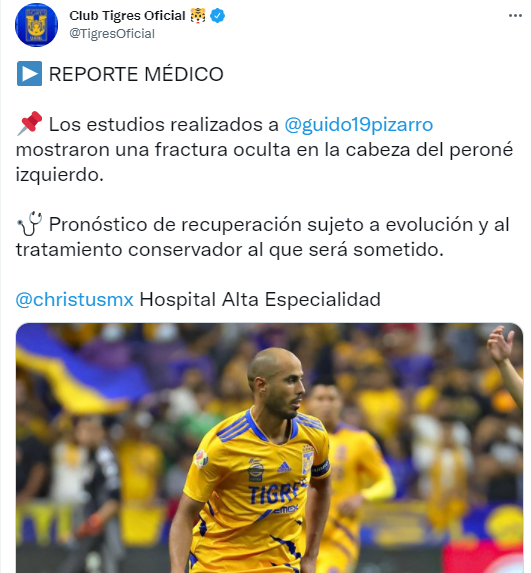Según el reporte médico, el problema óseo del Condelo tendrá fuera de las canchas de manera indefinida. “Los estudios realizados a Guido Pizarro mostraron una fractura oculta en la cabeza del peroné izquierdo. Pronóstico de recuperación sujeto a evolución y al tratamiento conservador al que será sometido”,fue lo que comunicó Tigres a través de su cuenta de Twitter.