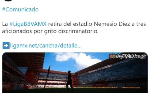 La otra cara de este enfrentamiento fue la aplicación del protocolo anti discriminación que la Liga MX debió emplear en La Bombonera. Según informó la entidad, “a través del Comisario y el personal de seguridad y operación del Estadio Nemesio Diez aplicó el protocolo preventivo contra actos discriminatorios durante el partido Toluca vs. Tigres correspondiente a la Jornada 2 del Torneo #GritaMéxicoA21″.