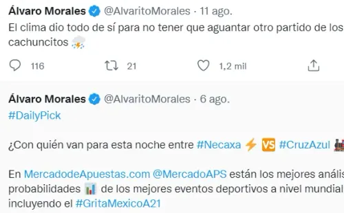 Si hablamos de periodistas con muchas interacciones en sus redes sociales tenemos que hablar de Álvaro Morales, miembro de ESPN yhabitualmente picante en sus declaraciones sobre futbol mexicano, principalmente con lo que le suceda a Chivas de Guadalajara y Pumas UNAM. Si es con derrota, mucho mejor.