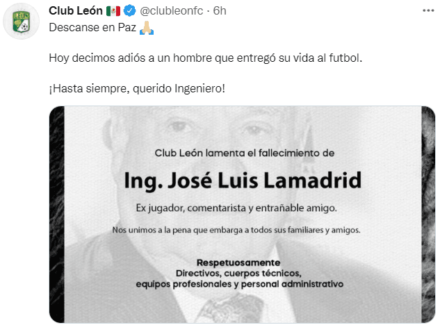 En las redes sociales, diferentes clubes y voces autorizadas del futbol mexicano despidieron con mucho respeto al Ingeniero Lamadrid. Se hicieron presentes personajes como Mikel Arriola, José Ramón Fernández,David Faitelsono Luis García, y equipos como el Club América, León, Necaxa oRayados de Monterrey.