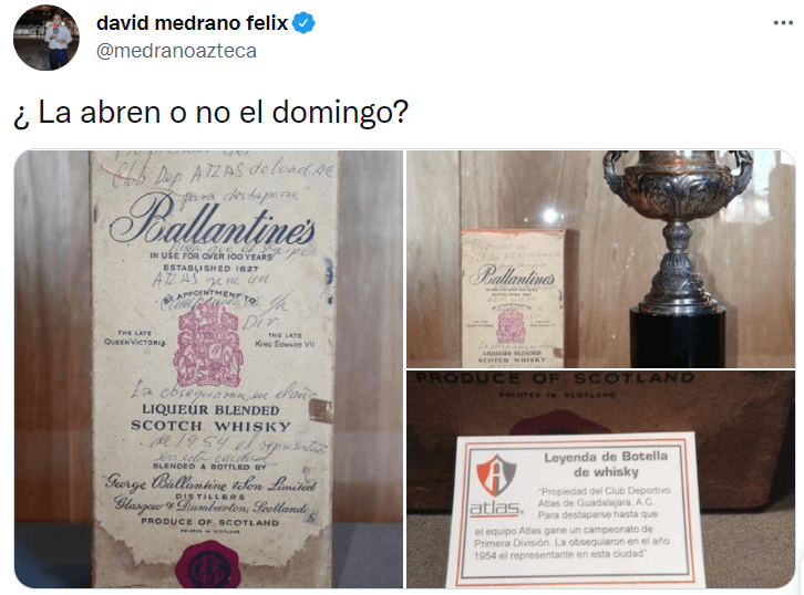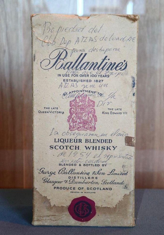 “Propiedad del Club Deportivo Atlas de Guadalajara A.C. para destaparse hasta que el equipo Atlas gane un campeonato de Primera División. La obsequiaron en el año 1954 el representante en esta ciudad”, se puede leer sobre la etiqueta del Ballantines de Escocia exhibida en las redes sociales.