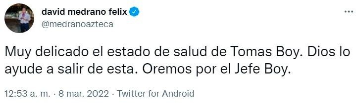 En la noche de este lunes 7 de marzo, diversos reportes indican que Tomás Juan Boy Espinoza se encuentra internado en un hospital de Santa Fe, en la Ciudad de México, en un delicado estado de salud. Si bien no se conoce oficialmente un reporte médico sobre su internación,las fuentes hablan de una complicación que comprometería su vida.
