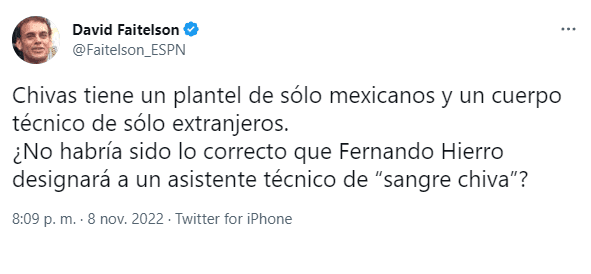 “Chivas tiene un plantel de solo mexicanos y un cuerpo técnico de solo extranjeros. ¿No habría sido lo correcto que Fernando Hierro designara a un asistente técnico de sangre chiva? Mexicano por nacimiento, no naturalizado. ¿De cuándo acá la selección por la que juegas determina tu nacionalidad?”, escribió en su cuenta de Twitter.