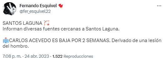 De acuerdo a información del periodista Fernando Esquivel, fuentes cercanas al cuadro lagunero afirman que Carlos Acevedo padece una lesión en el hombro, la cual lo marginaría de la competencia oficial por las próximas dos semanas. Es decir, el portero y figura del equipo se perdería la Jornada 17 y el partido por el Repechaje.