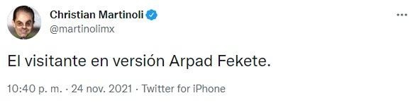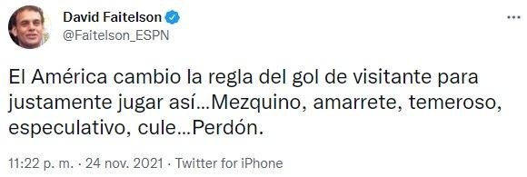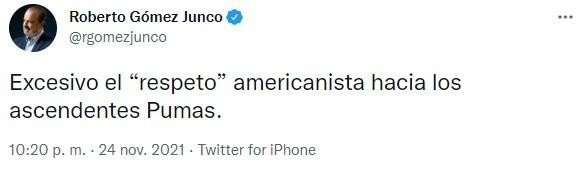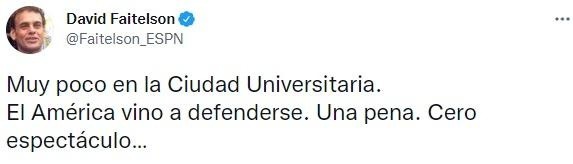 “Pumas, propone. El América, espera…Y se extraña el reglamento del gol de visitante, porqué el América parece dispuesto a firmar el cero x cero. Miserable postura del América en el primer tiempo, Como ‘equipo chico’“, fueron algunas de sus palabras en Twitter. “El América cambio la regla del gol de visitante para justamente jugar así…Mezquino, amarrete, temeroso, especulativo, cule…Perdón“, añadió en el ST.