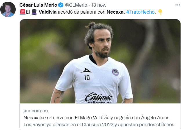 De acuerdo a información de Súper Deportivo, los Rayos tienen acordada la llegada de Jorge Valdivia para el próximo semestre del 2022. Según esta fuente, el Mago llegaría a Aguascalientes con el pase en su poder tras rescindir anticipadamente en Unión La Calera, por lo que solamente debería firmar su contrato para luego ser anunciado oficialmente.