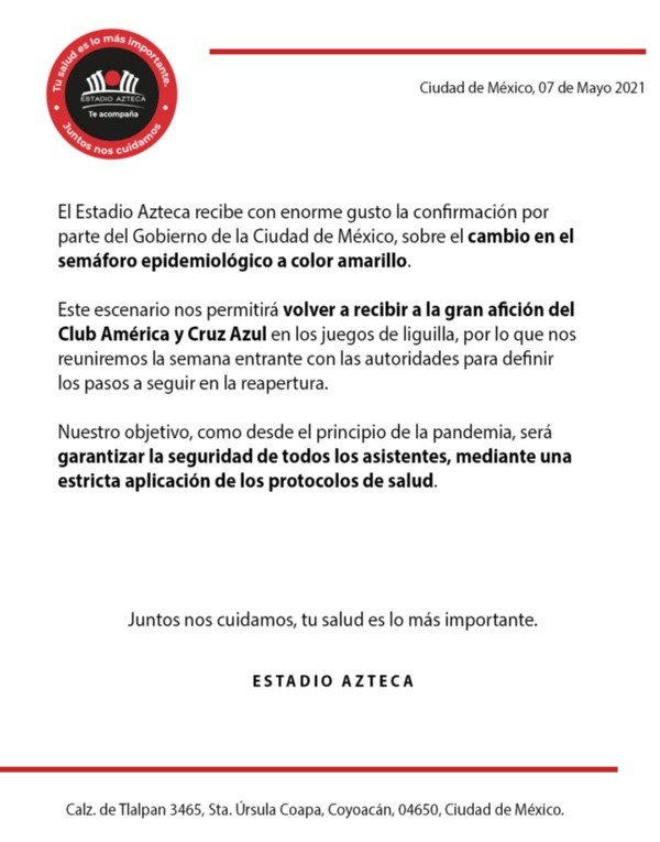 El Estadio Azteca podrá contar con un aforo del 25% del total de su capacidad, lo cual equivaldría a una cifra aproximada de21mil aficionados por partido, quienes en todo momento deberán cumplir con las medidas sanitarias establecidas, entre ellas el uso de cubrebocas obligatorio en todo momento, así como el código QR como requisito indispensable para entrar al inmueble.