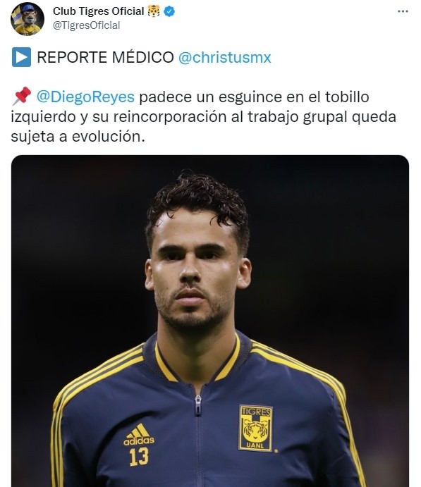 Diego Reyesno estará presente en el partido que Tigres UANL llevará a cabo ante Toluca debido a que “padece un esguince en el tobillo izquierdo“, según manifestaron en su cuenta oficial de Twitter. Lo que no dejaron en claro es cuándo será su retorno, ya que “su reincorporación al trabajo grupal queda sujeta a evolución”, añadieron.