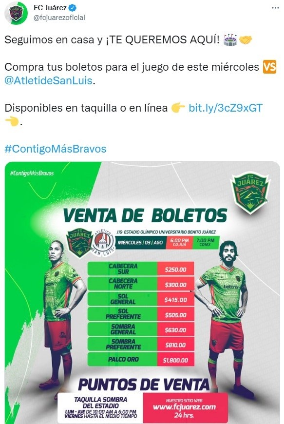 El partido entreFC Juárez vs. Atlético San Luisse llevará a cabo elmiércoles 3 de agosto a partir de las 19:00 hora CDMX, agregado que contará con la transmisión de Fox Sports, Fox Sports Premiumy Fanatizhacia todo México.