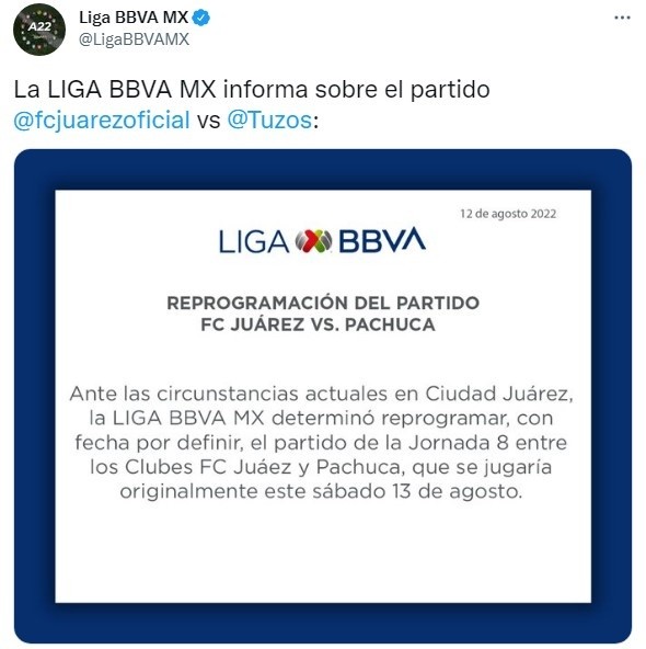 El partido que iban a protagonizarFC Juárez vs. Pachuca se suspendió debido tras los recientes hechos de violencia que se registraron en la ciudad de Juárez, lugar sede del encuentro.11 personas murieron y otras seis, identificadas como integrantes de losMexicles, fueron detenidas en un suceso que llevó a esta determinación de parte de la Liga MX hasta que todo pueda normalizarse.