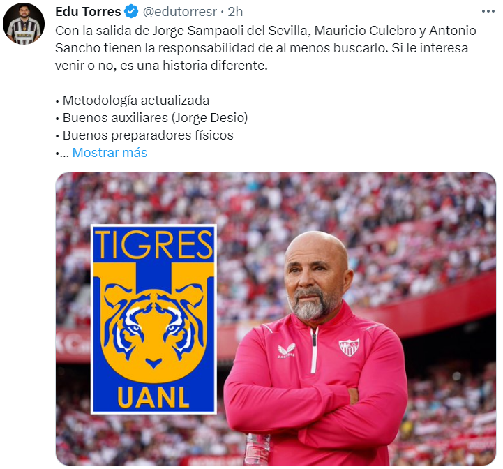 En un tweet que generó revuelo entre los fanáticos,Sampa es un candidato que reune condiciones para que desde Tigres realicen un intento. “Metodología actualizada, buenos auxiliares (Jorge Desio), buenos preparadores físicos, experiencia en Champions y Mundial, éxito deportivo, estilo de juego reconocible”, entre otras cualidades.