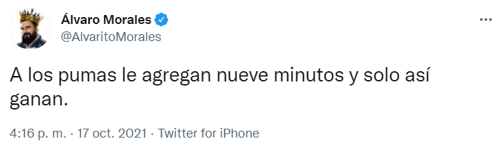 Ante este gol agónico y el triunfo para el equipo del Pedregal, no pudo faltar la crítica del reconocido anti Pumas y Chivas de Guadalajara, Álvaro Morales. A través de su cuenta de Twitter, el periodista de ESPN apuntó hacia el silbante y atribuyó el triunfo de los Universitarios a la cantidad de minutos adicionados.