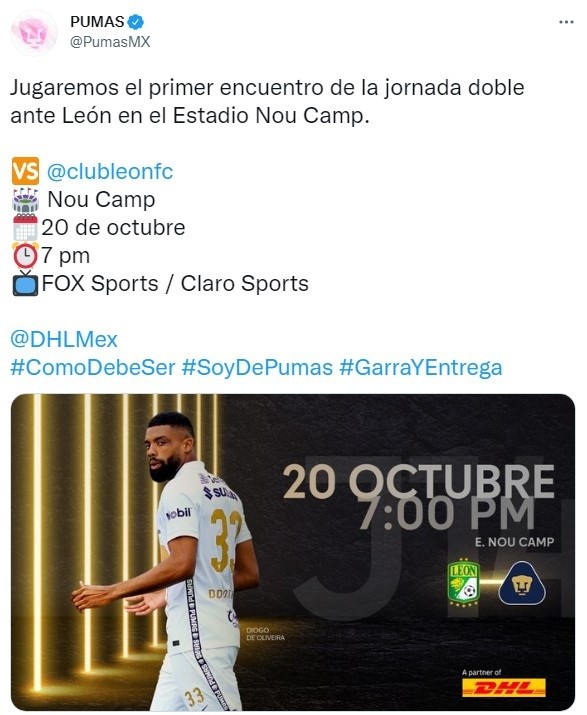 El duelo entreLeón vs. Pumas UNAM se realizará HOY,miércoles 20de octubre, y se llevará a cabo en elEstadio Leóndesde las 19:00 hora CDMX.