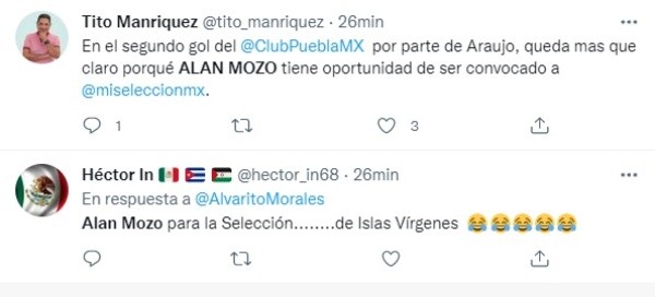 Por otra parte, a minutos de que se termine la primera mitad, Puebla volvió a encontrar espacio luego de que Maximiliano Araujo haya marcado tras un gran centro por parte de Gustavo Ferrarrei. Por otro lado, el culpable del gol fue Alan Mozo, por lo que los fanáticos estallaron, en particular porque se lo pide para la Selección Nacional de México.