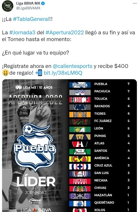 Se puso en marcha una nueva edición del campeonato en laLiga MX, en este caso con unApertura 2022que inició de forma pareja tras tres jornadas de disputa. Lo cierto es que entre los primeros 11 equipos de la tabla de posiciones hay una difrencia de solamente tres unidades, aunque todavía hay mucho recorrido por transitar.